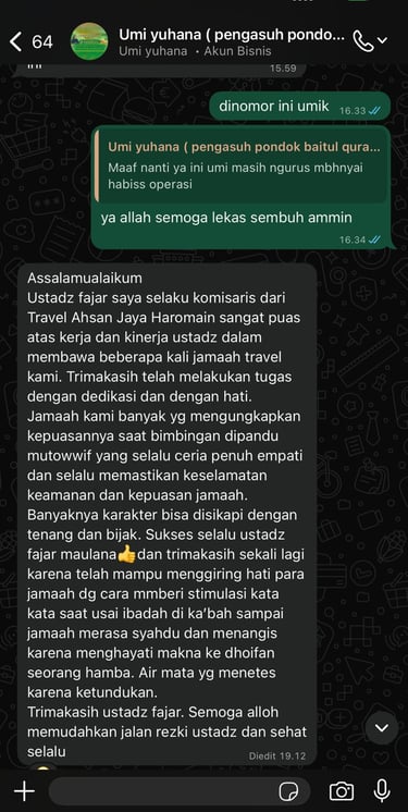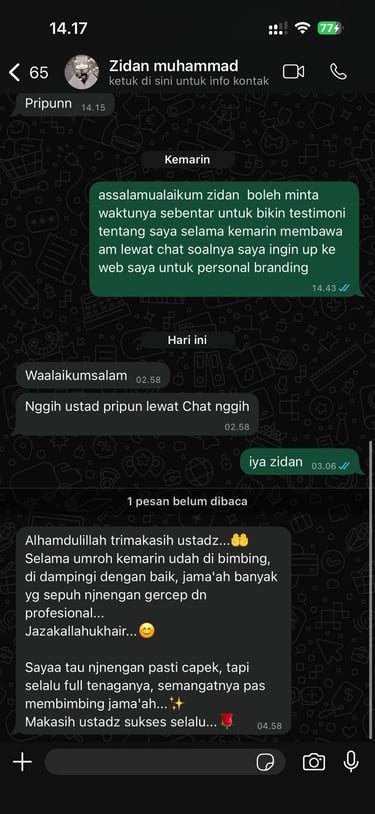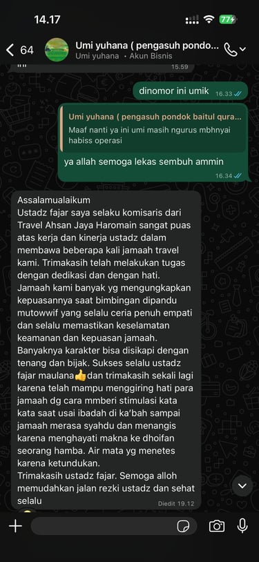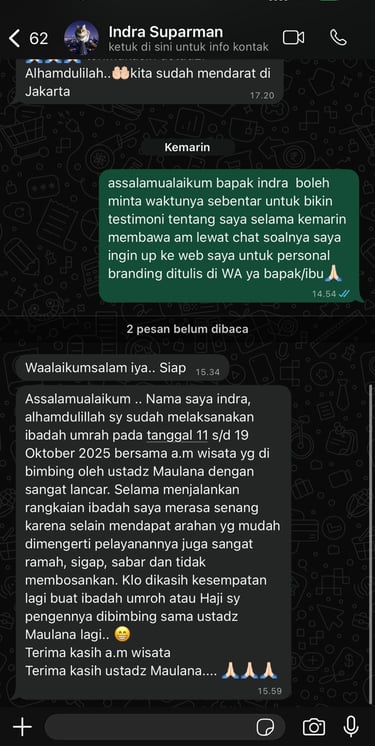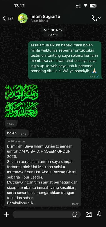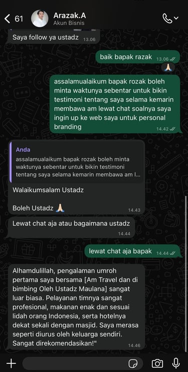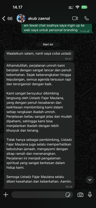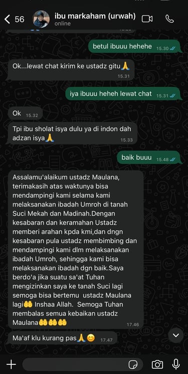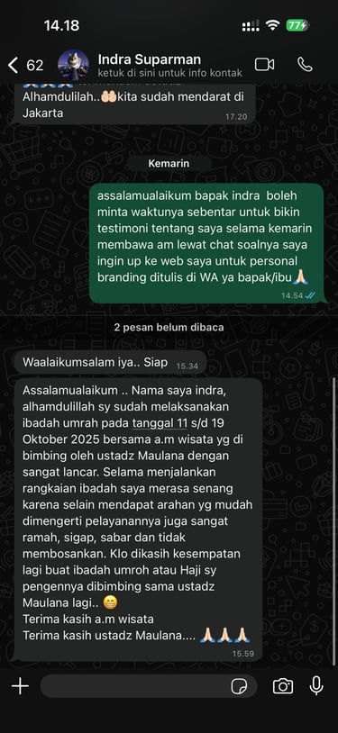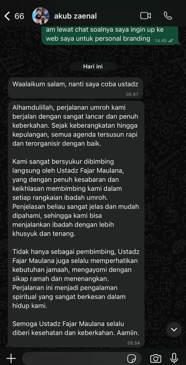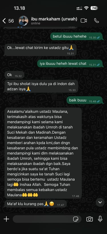 Dengan pendampingan yang tepat, Anda akan merasa lebih tenang dan percaya diri selama berada di Tanah Suci. Saya siap membantu, menjelaskan, dan mendampingi Anda di setiap situasi selama perjalanan ibadah.